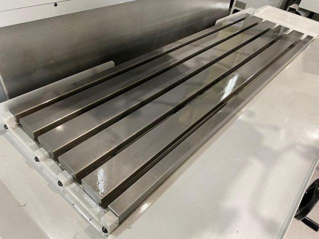 SPECIFICATION | Control unit: FANUC 32i-MODELB Table size: 1400 x 400 mm Max. work weight: 600 kg Table T-slot width and pitch: 18 (h7) P = 80 mm Number of table T-slots: 5 Travel X: 850 Y: 400 Z: 520 mm Spindle end to table top: 140 to 660 mm Spindle speed: 55~2,000 rpm Spindle taper: BT50 Machine required area: 2,954 x 1,870 mm Height: 2,499 mm Machine weight: Approximately 3,700 kg NC 2 axis (X, Y axis), Z axis manual Bullstat type tool attachment/detachment device (BT50) Chip coil conveyor Air blower for cutting chips (manual) Cutting tank (60ℓ) Processing guidance function | |||