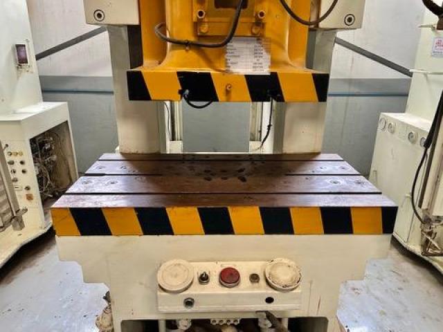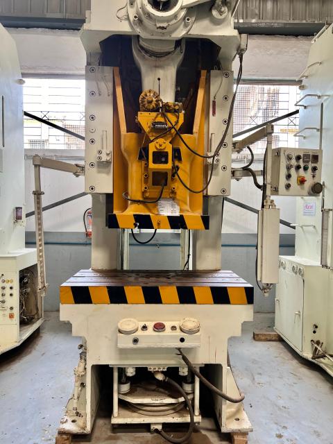 SPECIFICATION | C FRAME SINGLE CRANK PRESS Cap : 150Tons Stroke : 200mm Die Height : 400mm Adjustment : 100mm-Electrical SPM : 45 Slide : 670 x 500mm Bolster : 1240 x 630mm | |||