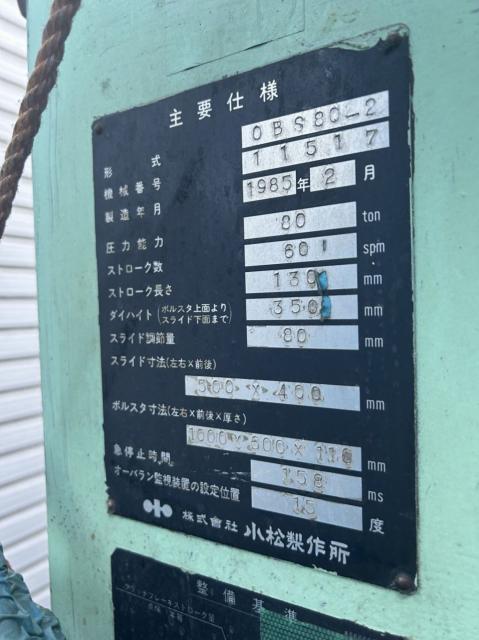 obs80-2 [Machine name] Press [Manufacturer] Komatsu [Model number] obs80-2 [Year] 1985 [Specifications/Overview] Die cushion included,