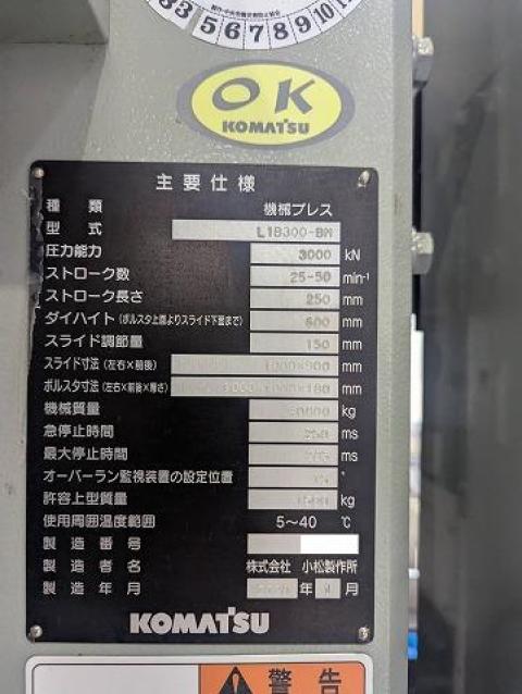 ◆Pressure Capacity: 3000kN ◆Stroke Rate: 25-50min-1 ◆Stroke Length: 250mm ◆Die Height (from top of bolster to bottom of slide): 600mm ◆Slide Adjustment Range: 150mm ◆Slide Dimensions (Left/Right * Front/Back): 1000 * 900mm ◆Bolster Dimensions (Left/Right * Front/Back * Thickness): 1000 * 1000 * 180mm ◆Machine Weight: 40800kg ◆Emergency Stop Time: 250ms ◆Maximum Stop Time: 285ms ◆Overrun Monitoring Device Setting Position: 15° ◆Allowable Upper Die Weight: 1500kg ◆Operating Ambient Temperature Range: 5-40℃ ✤In case of discrepancies between specifications and the actual product, the actual product will take precedence.